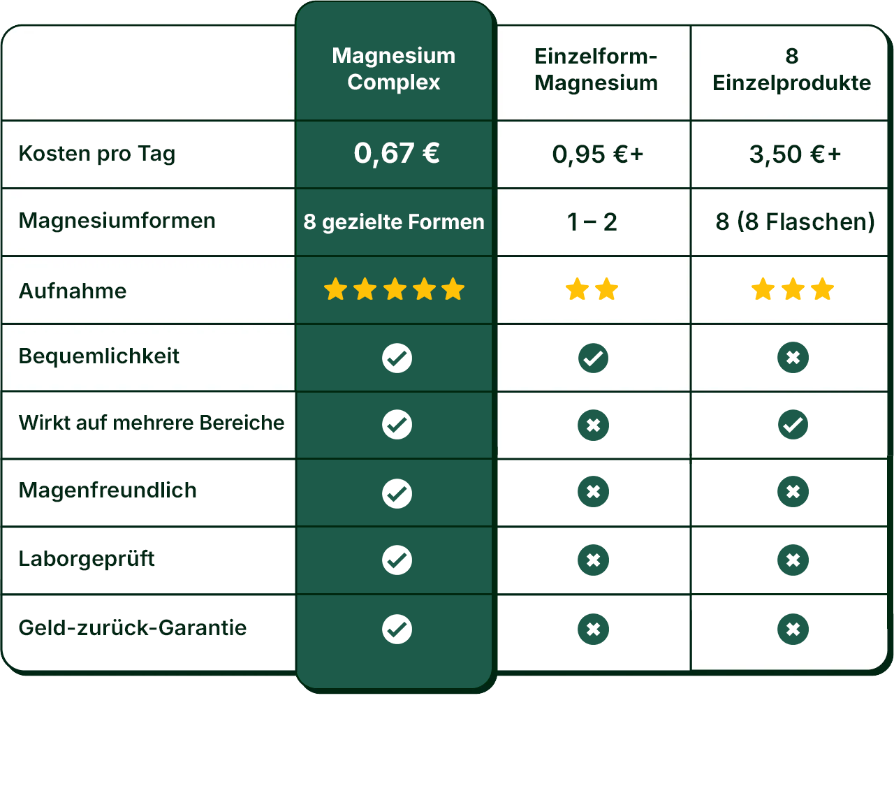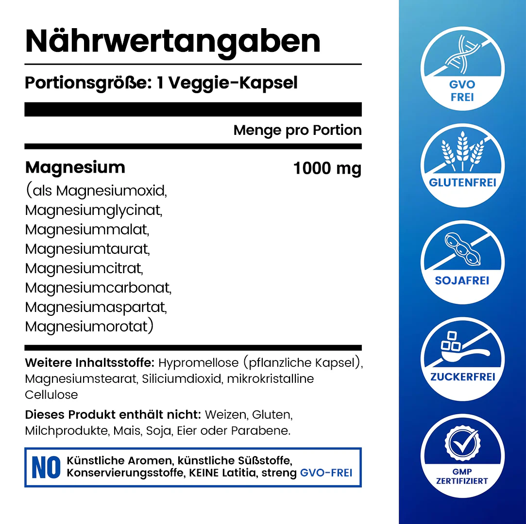 Umfassend: Alle 8 essenziellen Magnesiumformen in nur einer Kapsel – ersetzt mehrere Einzelpräparate zum Bruchteil der Kosten.